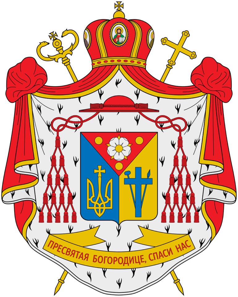 Червоний девіз на золотій стрічці звучить: «Пресвятая Богородице, спаси нас».